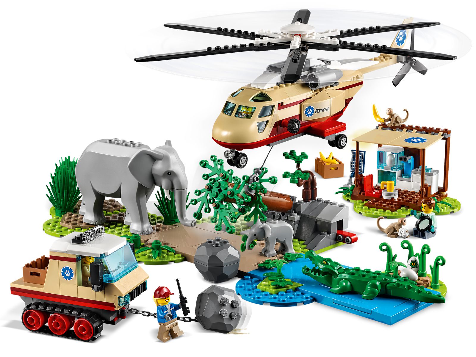 Wielomodelowy zestaw LEGO® City Na ratunek zwierzętom (60302) zawiera mnóstwo niezwykłych funkcji, w tym odlotowy helikopter z wyciągarką, pojazd gąsienicowy, scenerię imitującą sawannę z funkcją osuwiska oraz polową klinikę weterynaryjną. W komplecie są też zabawkowe słonie, krokodyle, małpa i zespół ratowników, więc dzieci mogą liczyć na wiele godzin nieograniczonej zabawy w ratowanie zwierząt.